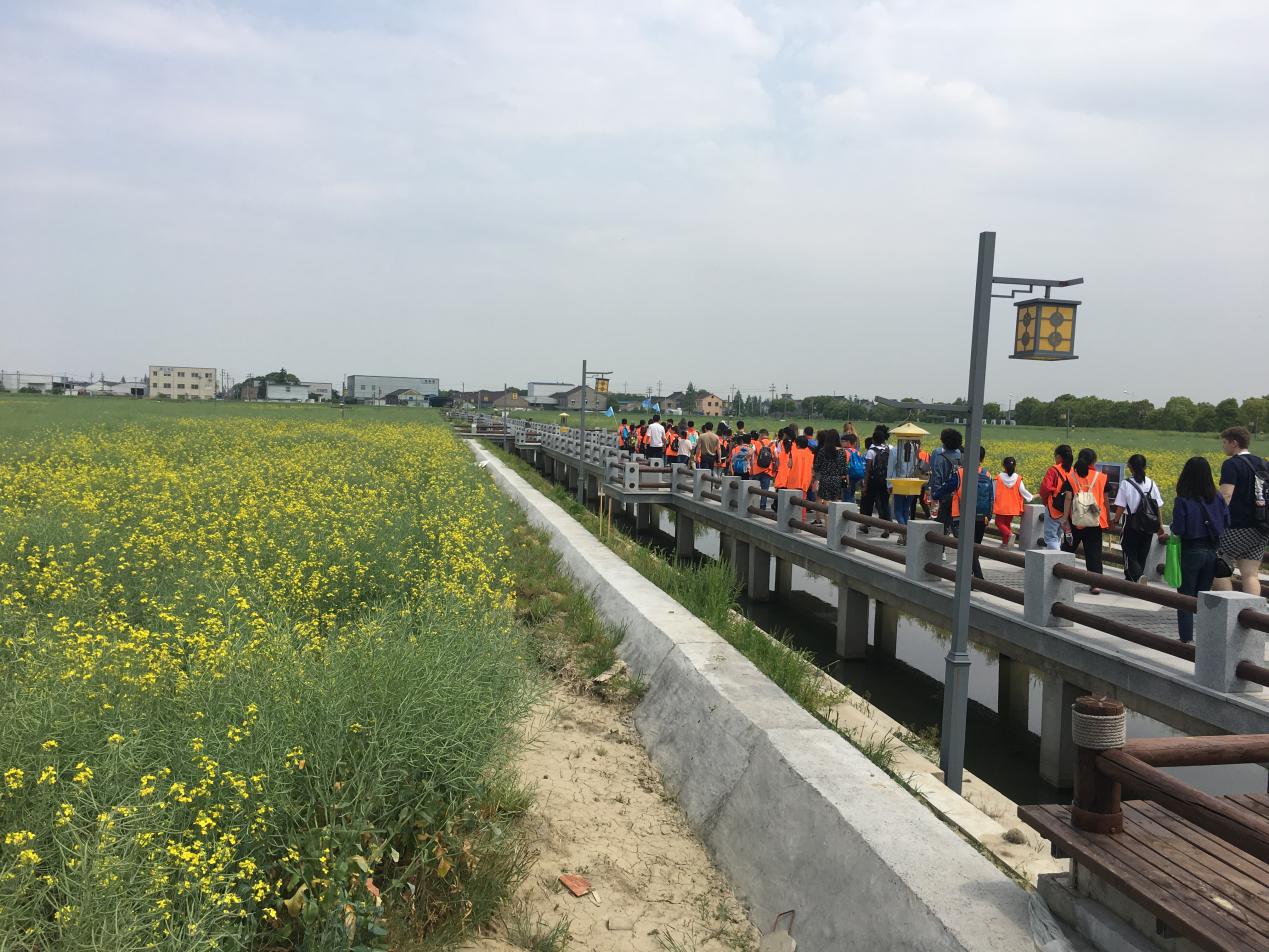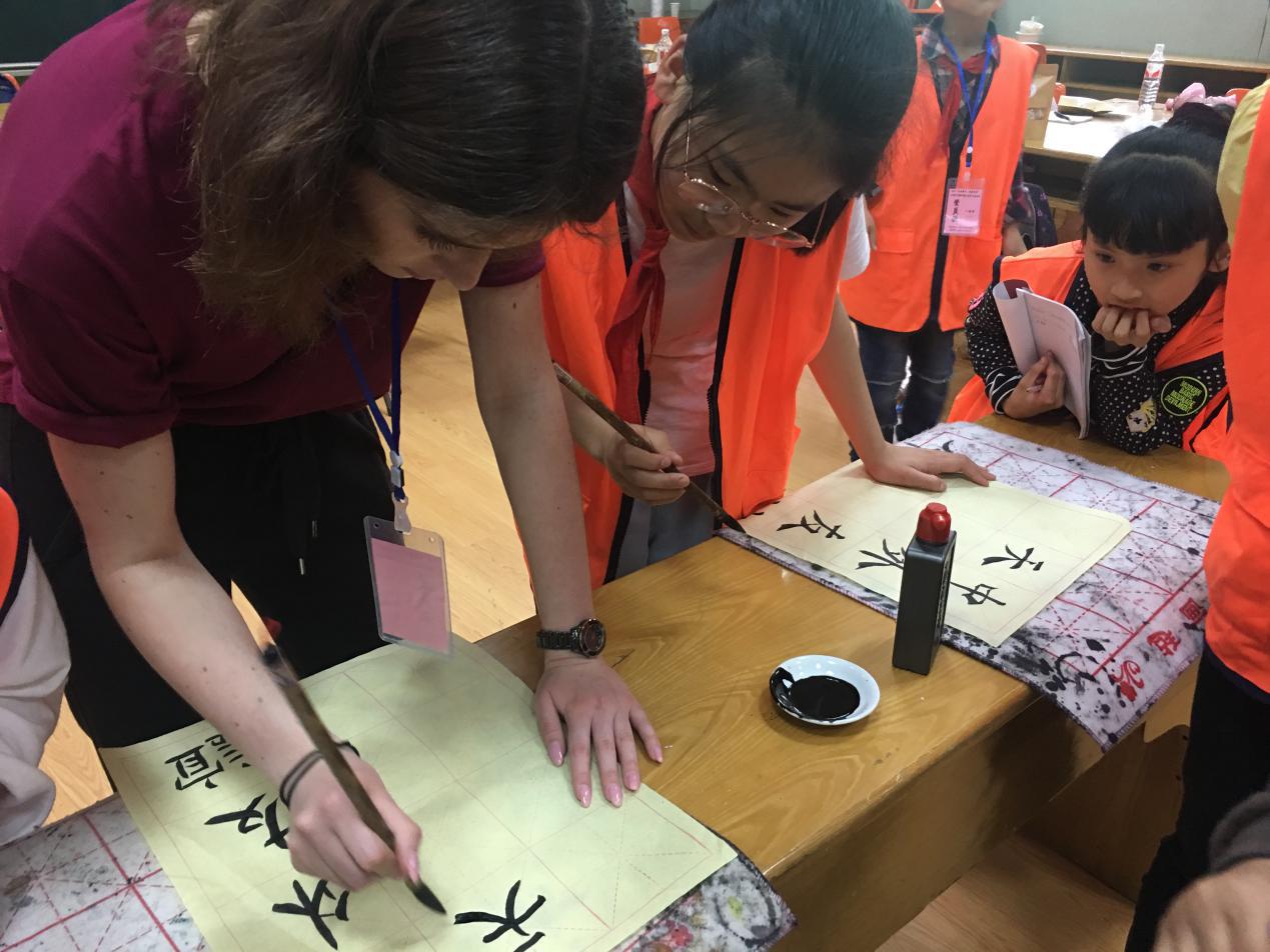 下午,留学生们和孩子们前往丁桥新仓村谷堡,体验江南水乡的农耕农作文化。大家在工作人员的带领下,漫步在120亩的谷堡内,虽然这里的油菜花已经凋谢,但是这丝毫不影响大家游览的兴致,留学生们纷纷拿起手机记录下眼前的美景。随后,大家一起走进农耕博物馆,感受农耕文化的历史变迁;一起观摩爆米糖的制作过程,看民间艺人手摇爆米花机,听爆米花的巨响,品尝爆米花糖的香甜;一起在民间艺人的指导下,学习玉米叶编织技艺,感受稻作文化的丰富内涵。结束了新仓村谷堡的参观之后,留学生们又返回海宁青少年宫,体验中国的书法艺术,并对孩子们书写的汉字赞不绝口。