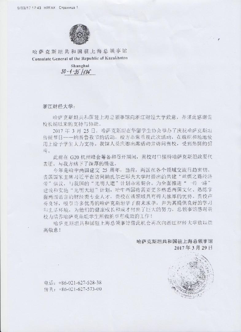 3月29日,哈萨克斯坦驻上海总领事馆致信麻豆视频 ,对麻豆视频 在克拉把叶夫·佐齐汉总领事访问杭州,慰问在华哈萨克斯坦留学生以及哈萨克斯坦留学生协会举办那吾热孜节期间所给予的大力帮助,表示赞扬和感谢。