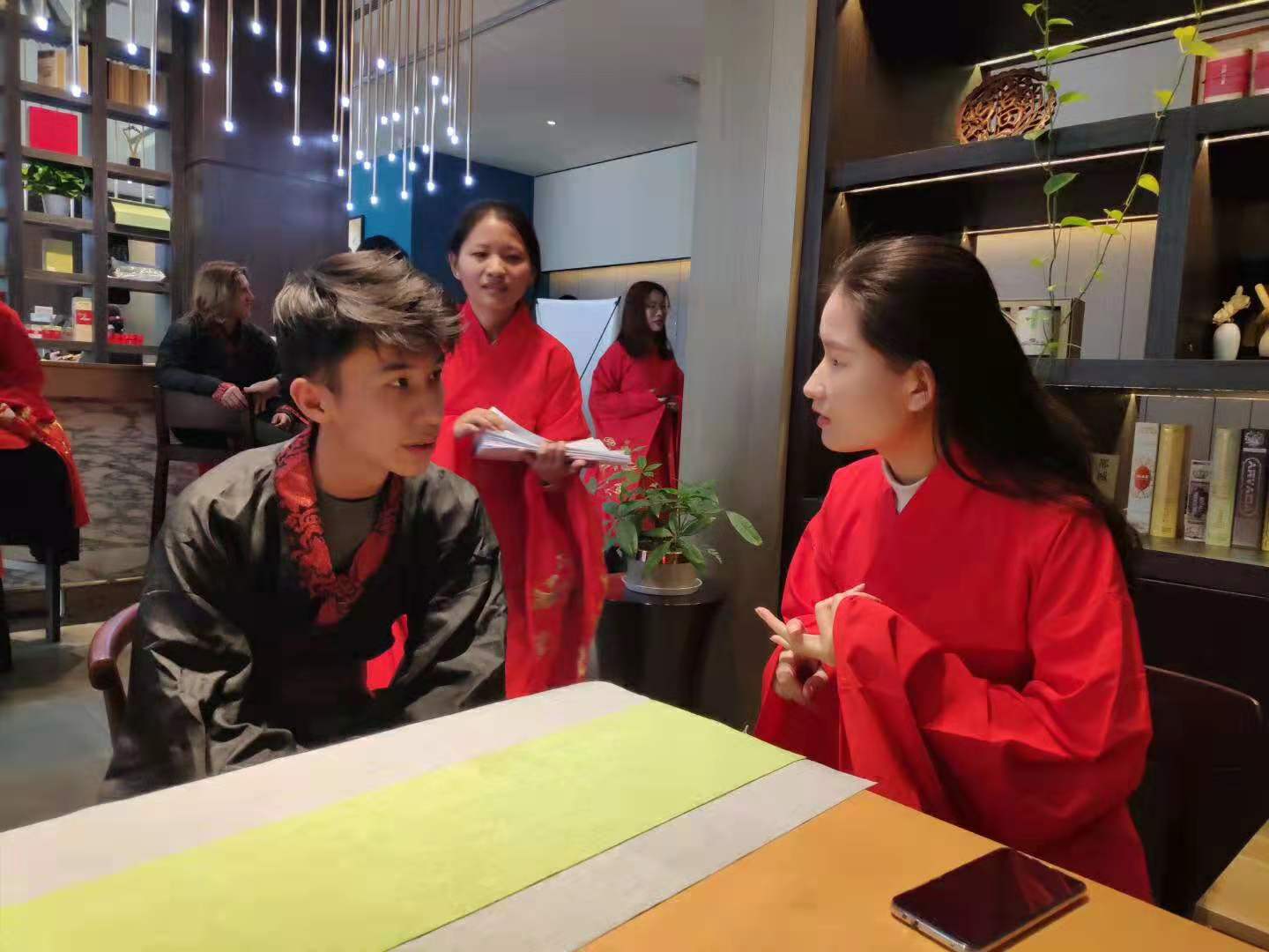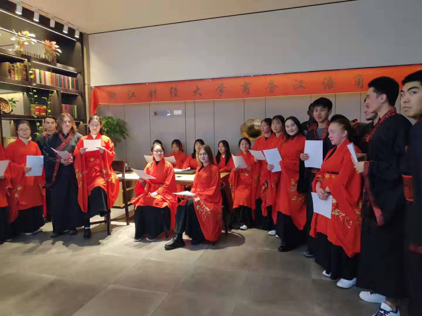 2019年12月5日,我院留学生一行十人受邀参加人文与传播学院举办的商务汉语角第五次活动。中外学生欢聚一堂,齐声朗读我国第一部诗歌总集《诗经》中的诗篇《蒹葭》。抑扬顿挫、声情并茂的朗读声和谐悦耳,中外学生都沉浸在了《蒹葭》那美好的诗情画意中。