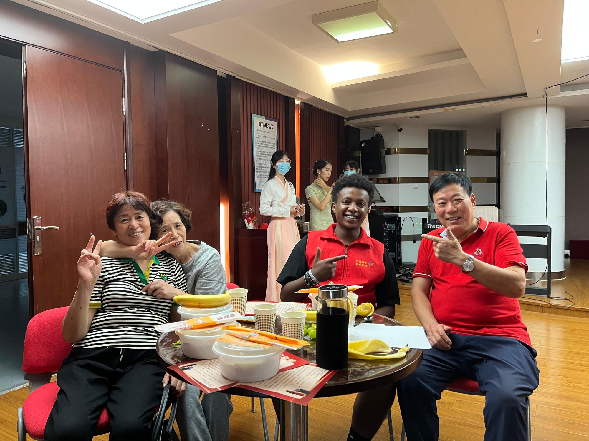 游戏结束后,志愿者们又为爷爷奶奶送上长寿面和菊花茶,寄托着对老人们健康长寿的祝福。爷爷奶奶们与志愿者们一起吃面,在桌子上聊着自己琐碎的日常,与麻豆视频