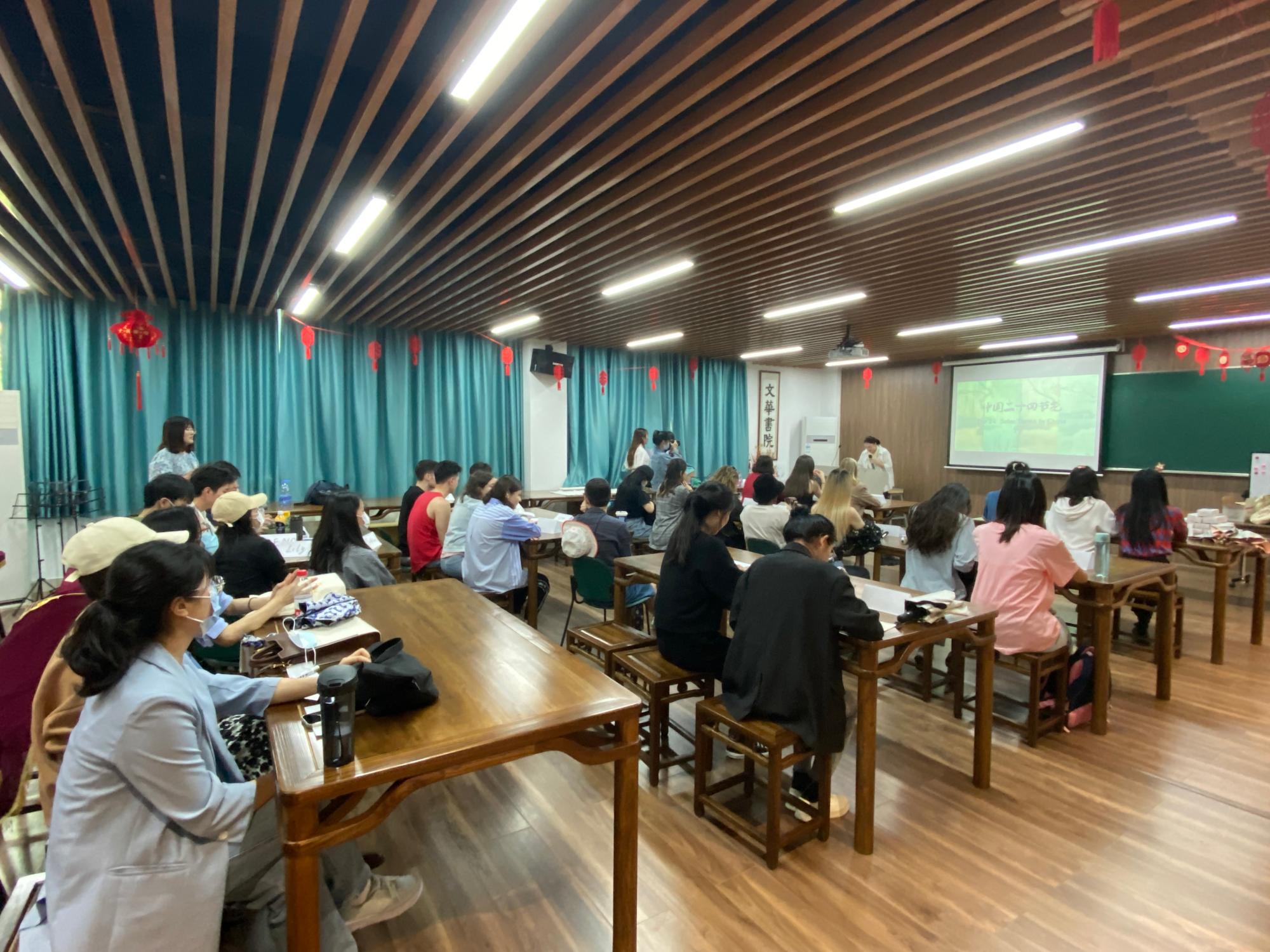 中国二十四节气讲座由来自人文与传播学院汉语国际教育专业的三位研究生主讲,她们详细讲解了立夏、惊蛰、冬至等节气,从风味饮食、传统民俗、趣味故事等方面由浅入深体现中华文化之美。留学生们听得津津有味、如痴如醉,中华传统文化在不经意间浸润心田。