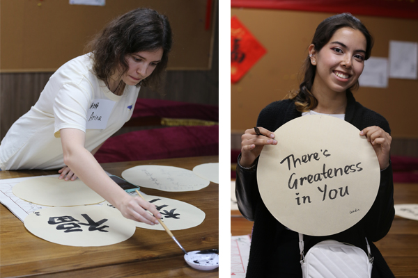 文华书院的文化导师,外国语学院大学外语部主任张迅副教授分享自己的青年时期的经历,并对青年学子们提出了期望:应对挑战抓住机遇,并邀请同学们拿起毛笔,将对相互的青春励志的话语写在宣纸上,并赠予对方。