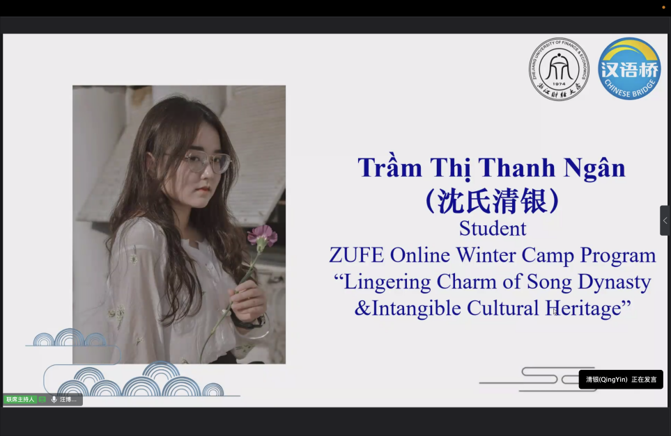 汉语直播课许光老师表达了对学员们的良好祝愿,希望学员们要坚持学习中文,期待同学们来中国体验中华文化,学习深造。来自越南的学员代表Trầm Thị Thanh Ngân(沈氏清银)和DO THI THUY(杜氏水)分享了她们在汉语桥10天学习的体会,两位同学流利地汉语发言令人印象深刻。她们都说到,通过在线视频、汉语课堂互动和讲座,不仅看到很多美丽的风景,也了解了宋韵文化。同时也对本次汉语桥所有教师的辛勤付出表示感谢。