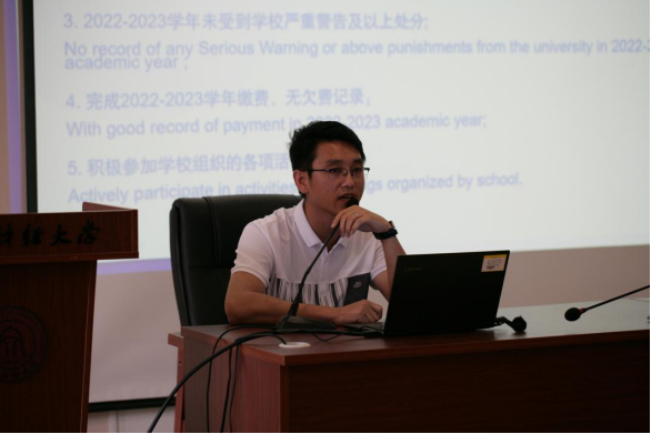 留学生辅导员汪博林就交通出行、住宿安全、预防溺水等几个方面进行了安全宣讲和教育,同时强调了放假与返校报到时间,要求大家服从学校统一安排与管理,严格遵守暑假留校与离校的相关要求。