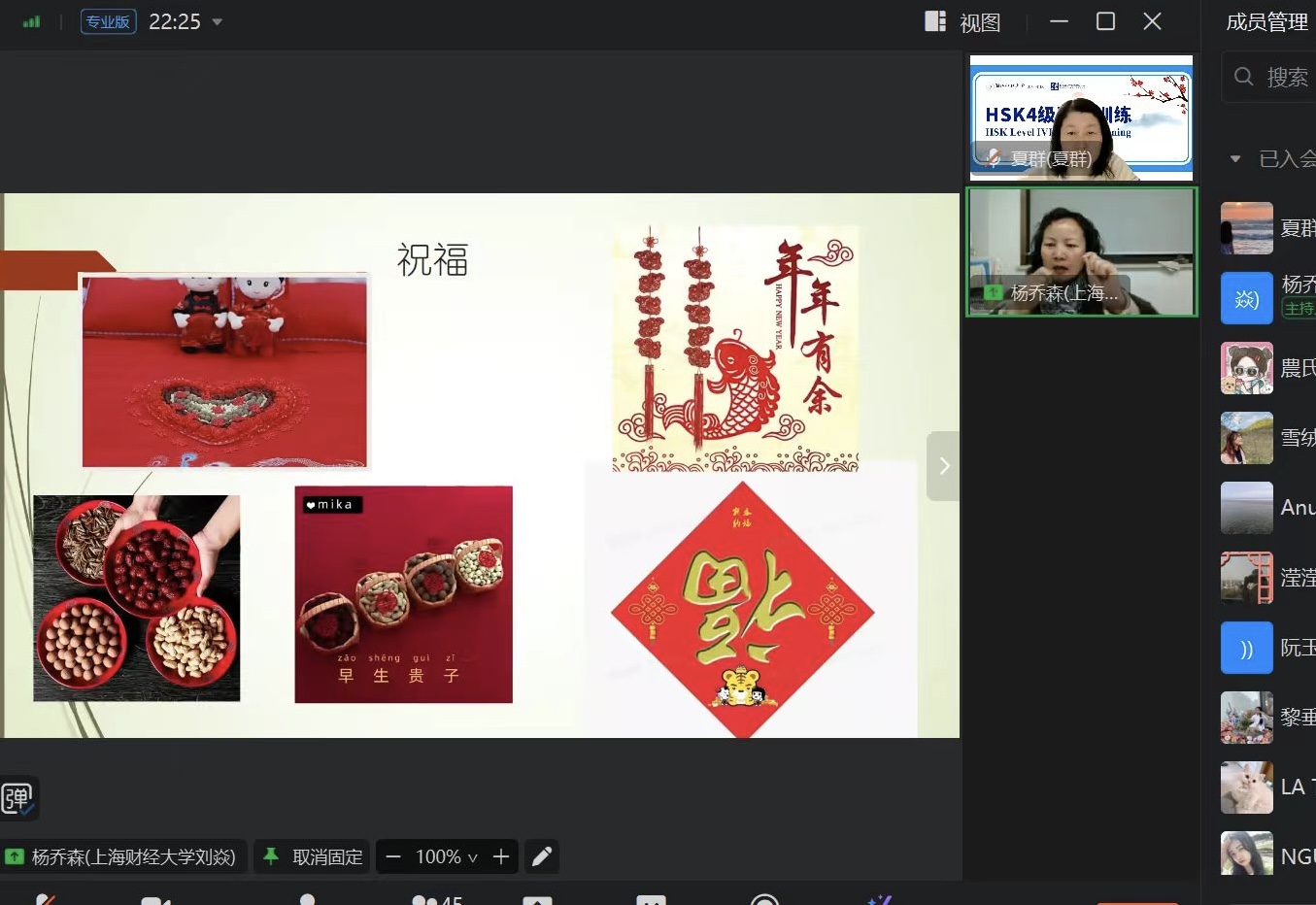 本项目按照《国际中文教育中文水平等级标准》四级汉语水平要求,以“录播课程+实时授课”相结合的方式进行教学。无论是录播课程还是在线课堂,都为学员们提供HSK4级范围内重点词汇和句型的精讲精练、篇章理解等技能训练,以迅速提升备考能力,学员们受益匪浅。此外,项目还聘请了上海财经大学国际文化交流学院刘焱教授、杭州师范大学人文学院杨建忠教授等汉语语言学专家,开启了两场精彩的语言与文化相互交融的云端畅游之旅。专家们不仅学术成就突出而且对外汉语教学经验丰富,把艰涩难懂的语言点讲解得深入浅出、绘形绘色,让学员无论是对汉字还是词句运用背后的深刻涵义感受叹为观止,既拓宽了视野又加深了对中国语言文化的认同。