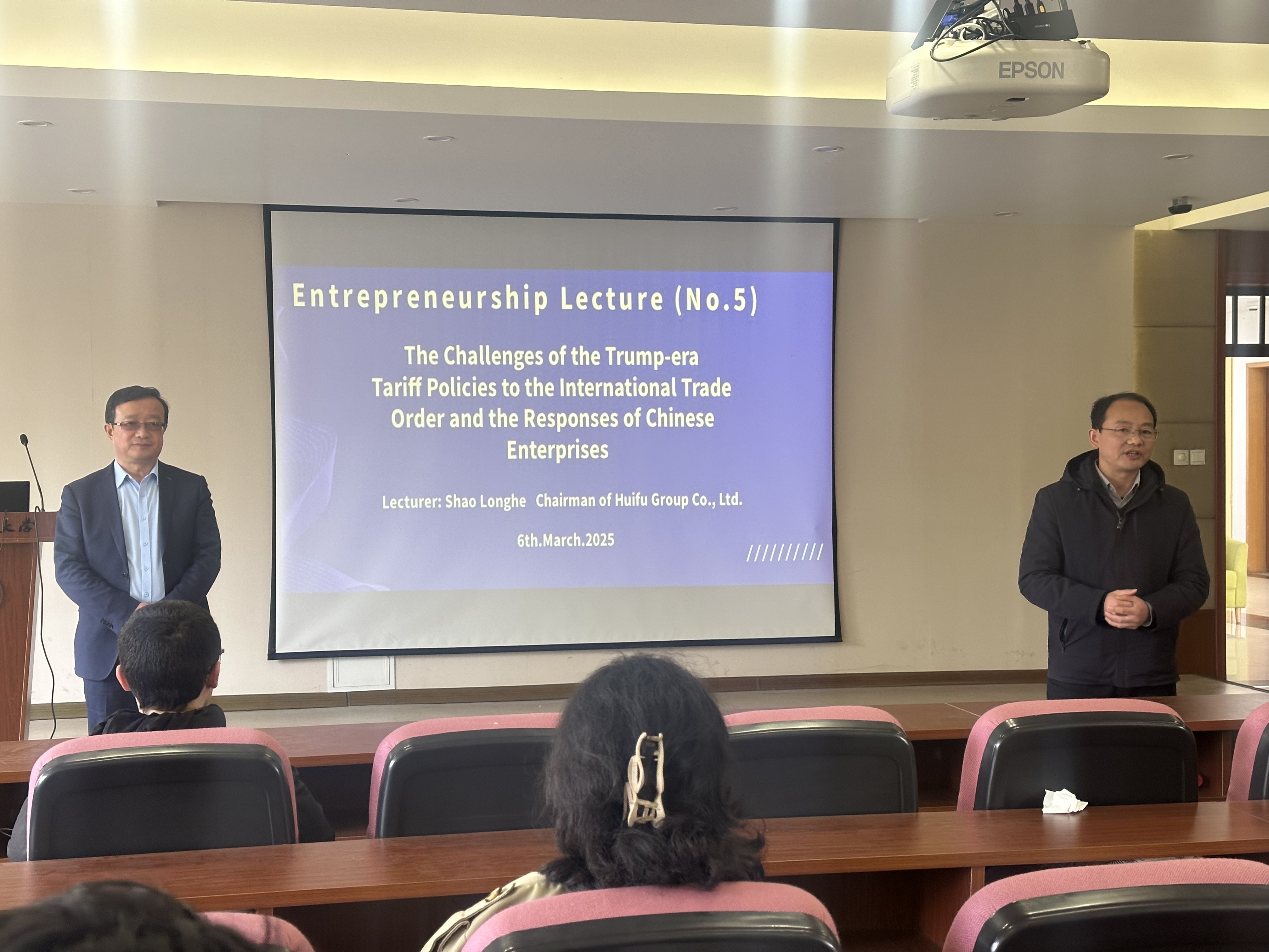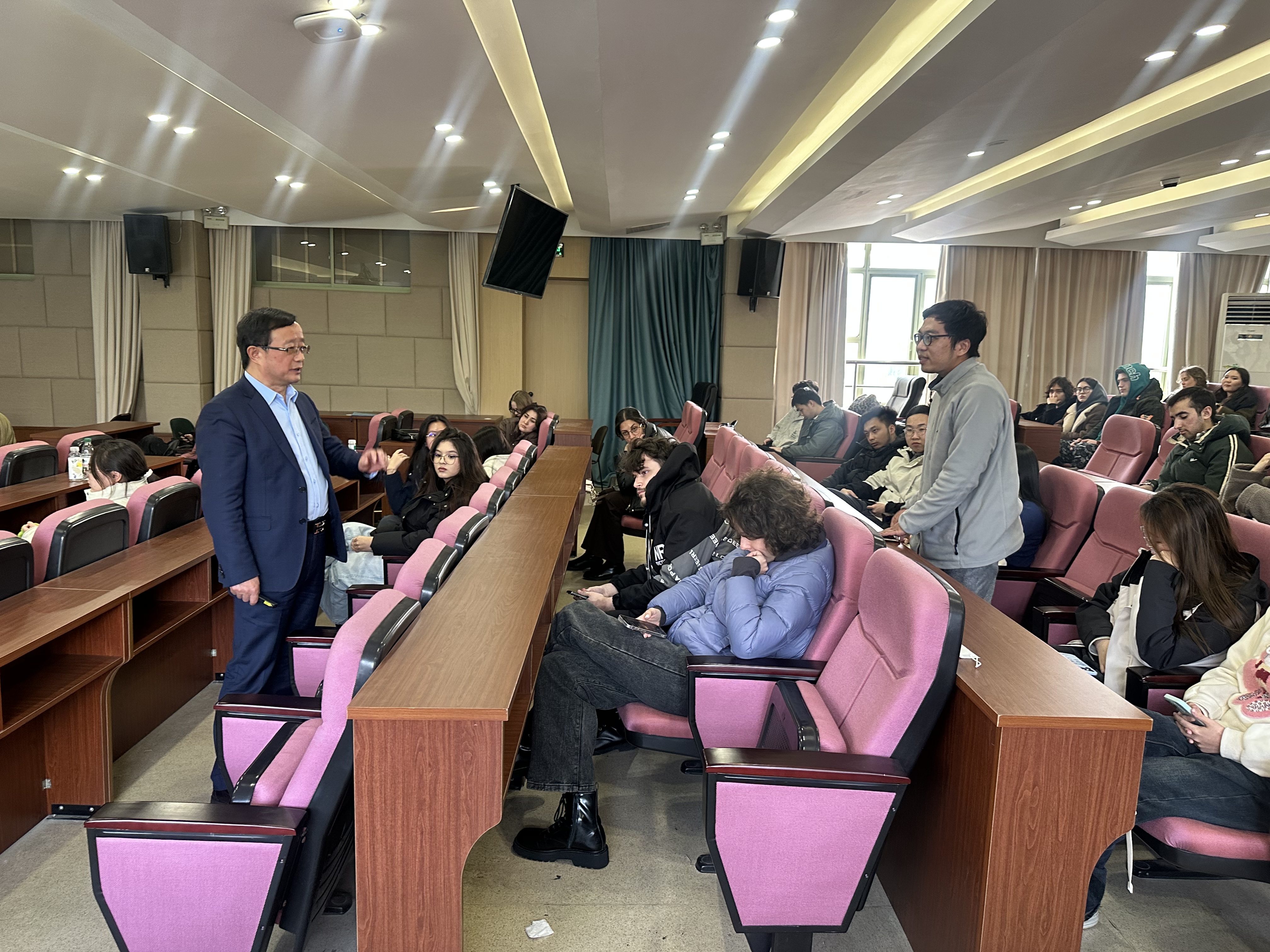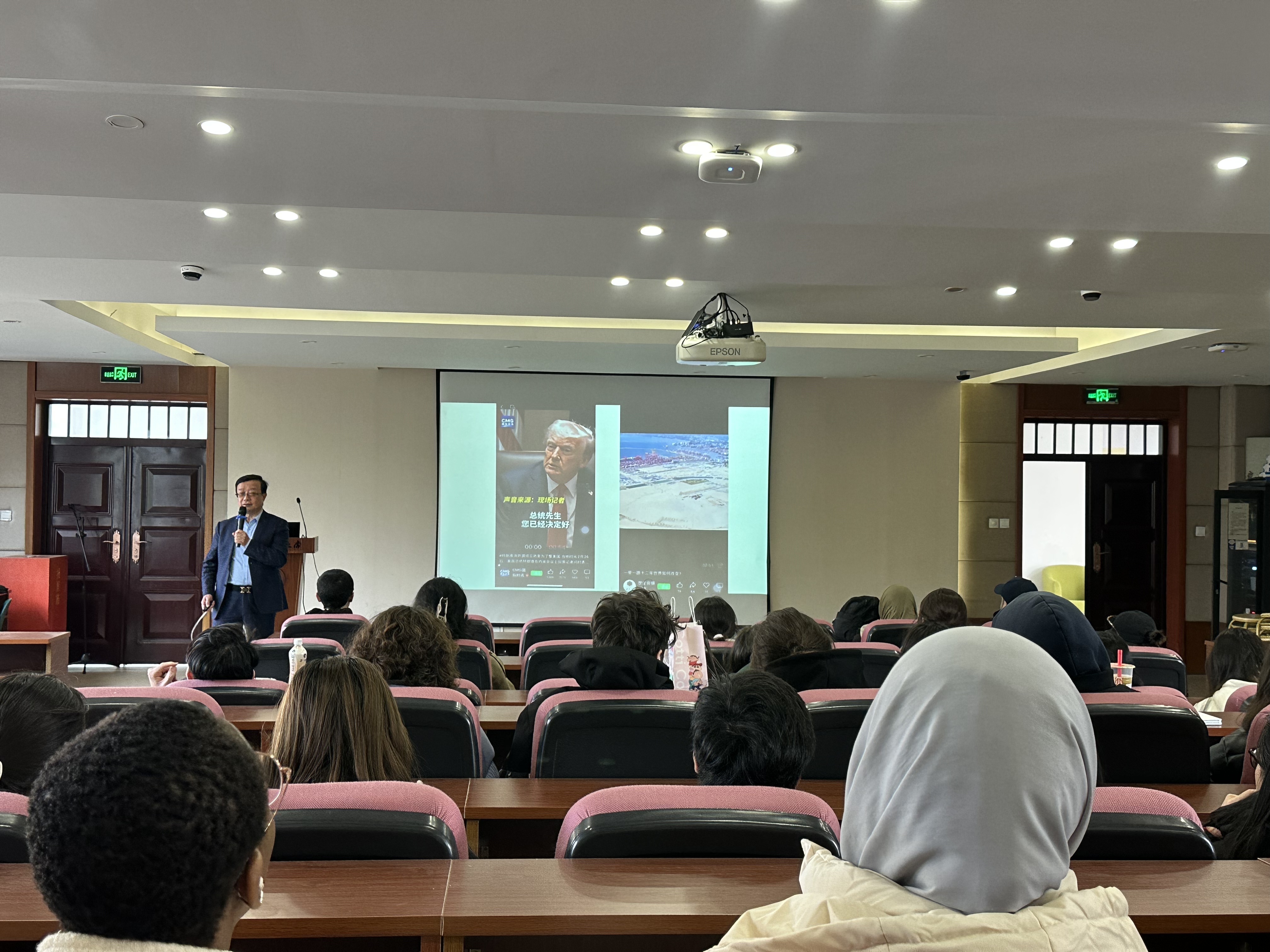 给留学生作了题为“The Challenges of the Trump-era Tariff Policies to the International Trade Order and the Responses of Chinese Enterprises”的讲座,百余名中外学生参加了本次讲座。