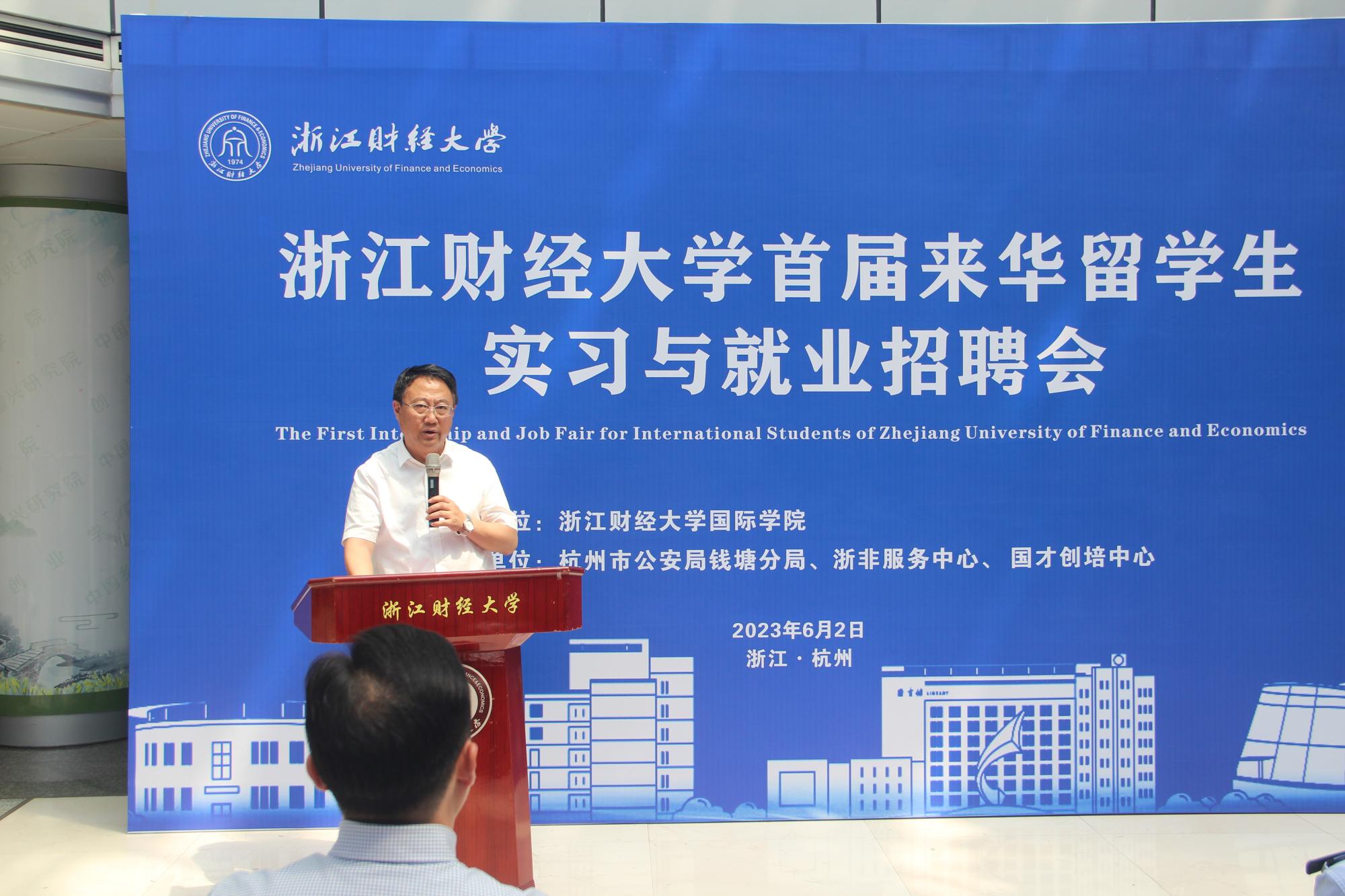 副校长李占荣致辞,他首先表示了对此次参会师生和企业代表的欢迎,接着介绍了麻豆视频 多年来的办学成果和专业优势。他指出,希望借助实习与就业招聘会,增进校企联动,为麻豆视频 的专业实践与就业提供更多机会,提升留学生培养质量,也为浙江企业的国际化发展提供更多动力,共同打造浙江国际化的明天。