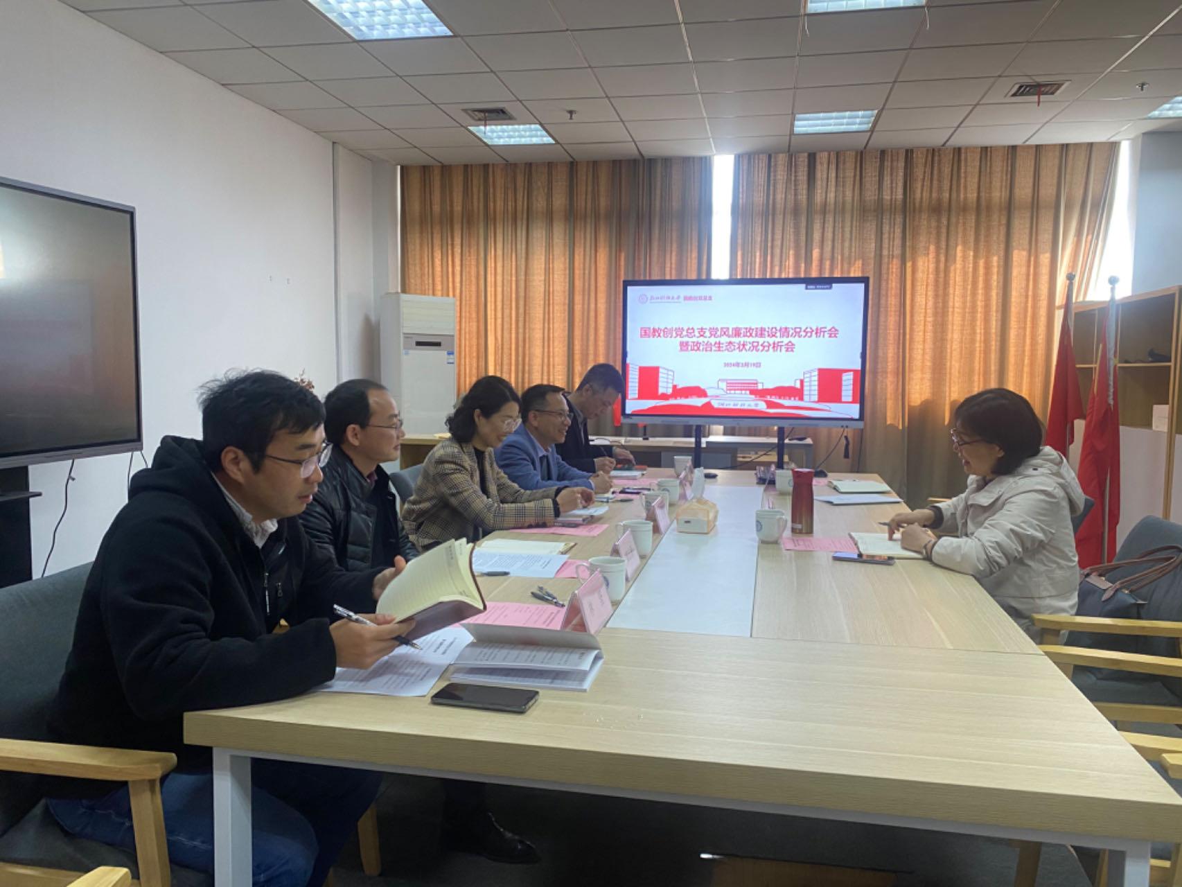 3月19日,党总支召开新学期党风廉政建设情况分析会暨政治生态状况分析会,校纪委委员林凡、党总支全体班子成员列席参会,会议由党总支书记黄金娟主持。会上,黄金娟对2023年度党风廉政建设情况、政治生态情况进行了分析,党总支纪检委员林坚就2023年度履行监督责任情况进行分析,并布置2024年清廉国教创推进工作。各分管负责人围绕促进本部门、单位党员干部廉而有为、勤勉敬业,共同推进“新财经战略”落地落实落细开展分析,重点分析现阶段存在的突出问题和廉政风险,研究提出整改落实举措。与会人员围绕落实党风廉政建设主体责任、监督责任、主要负责人“第一责任”、领导班子成员“一岗双责”等情况进行问题查摆,研究提出改进措施。
