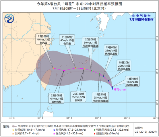 The Central Meteorological Observatory announced that this year's No. 6 Typhoon "烟花" (English name: In-Fa) had been generated over the Northwest Pacific Ocean at 2 a.m. on July 18. According to the information from the Meteorological Department, Typhoon "In-Fa" will move into the southern waters of the East China Sea on the 22nd. "In-Fa" will have a serious impact on Zhejiang. Please take precautions to ensure your own safety.