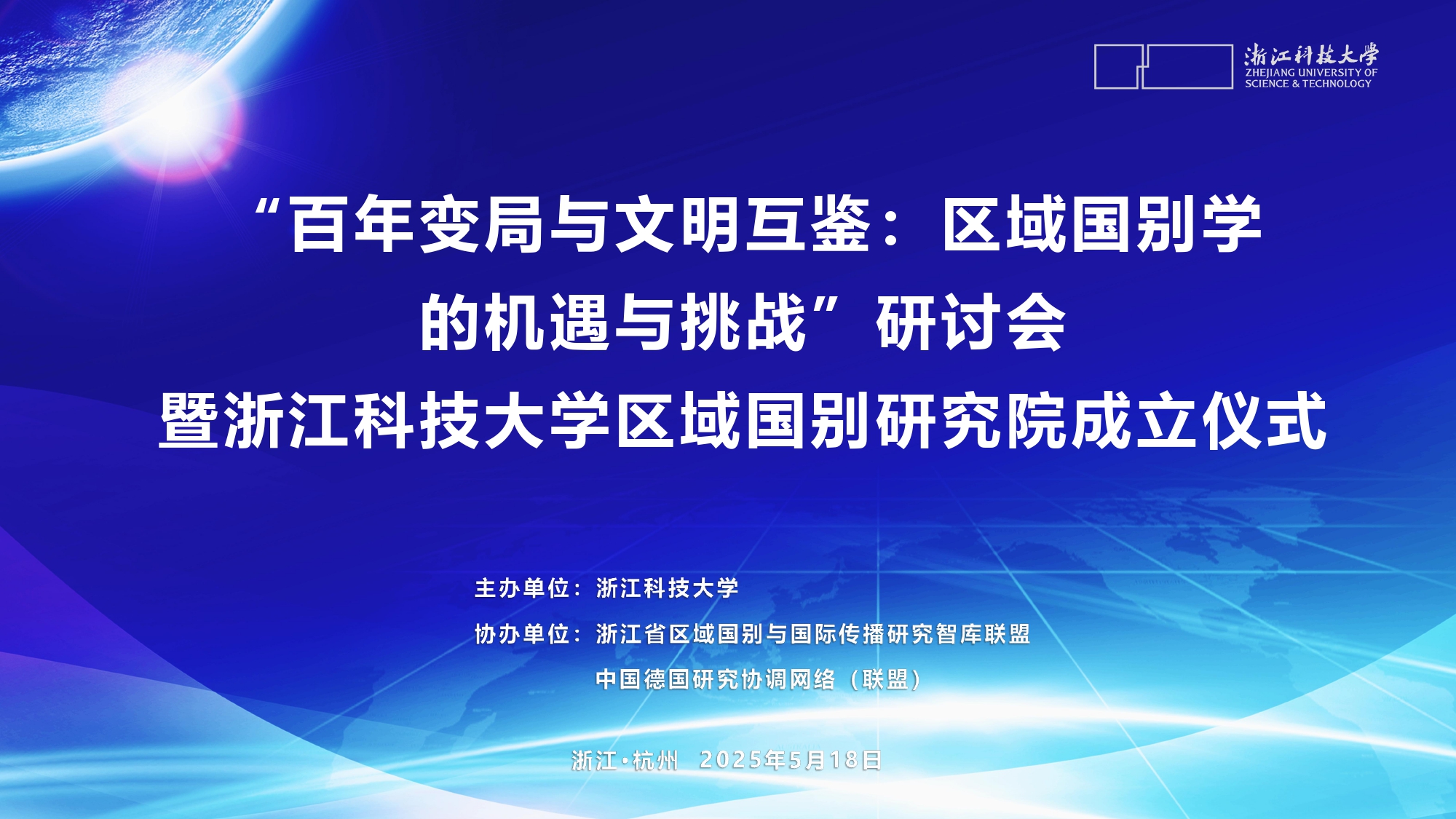 2025年5月18日,“百年变局与文明互鉴:区域国别学的机遇与挑战”研讨会暨浙江科技大学区域国别研究院成立仪式在浙江科技大学顺利举行。会议由浙江科技大学主办,浙江省区域国别与国际传播研究智库联盟、中国德国研究协同网络(联盟)协办,浙江科技大学德语国家研究中心、浙江科技大学中德学院承办。